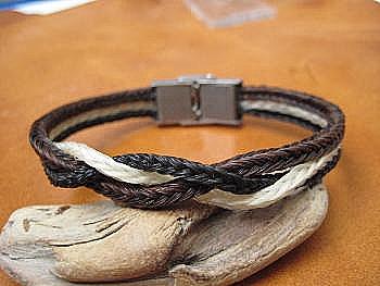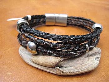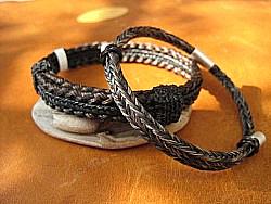 Armband variabel einstellbar, aus 3 Stck. zusammengearbeitete Geflechte, schwarz/braun, ca. 1cm breit, Durchschlupfmaß ca. 25cm; 95,- € Armband variabel einstellbar aus 1 Stck. Rundzopf --verkauft-- mit aufgezogenem Sterling-Silber-Röhrchen und Echtsilber-Endstücke = 50,- €