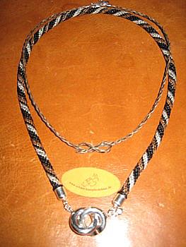 R Unten: Halsschmuck mit Vorderverschluß : 3-farbig äußerst filigran gehitcht mit 925er-Sterling-Silber RinginRing-Vorderverschluß, Lg. ca. 48cm. Preis: 159,- € Oben: stringgeflochten mit 8-Knoten (Unendlichkeitszeichen) und Sterlingsilber Karabinerverschluß, Lg. ca. 41,5cm. Preis: 55,- €